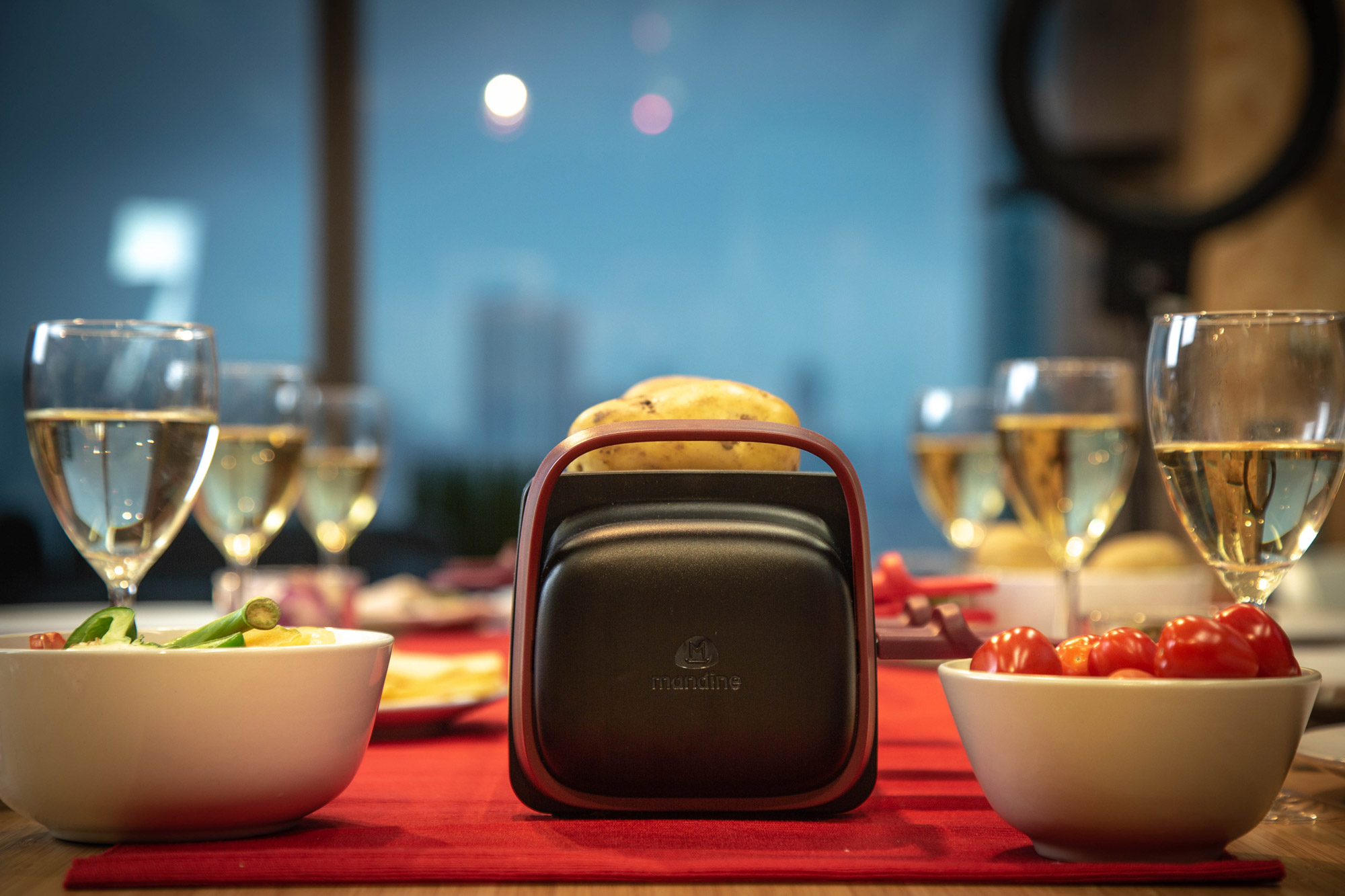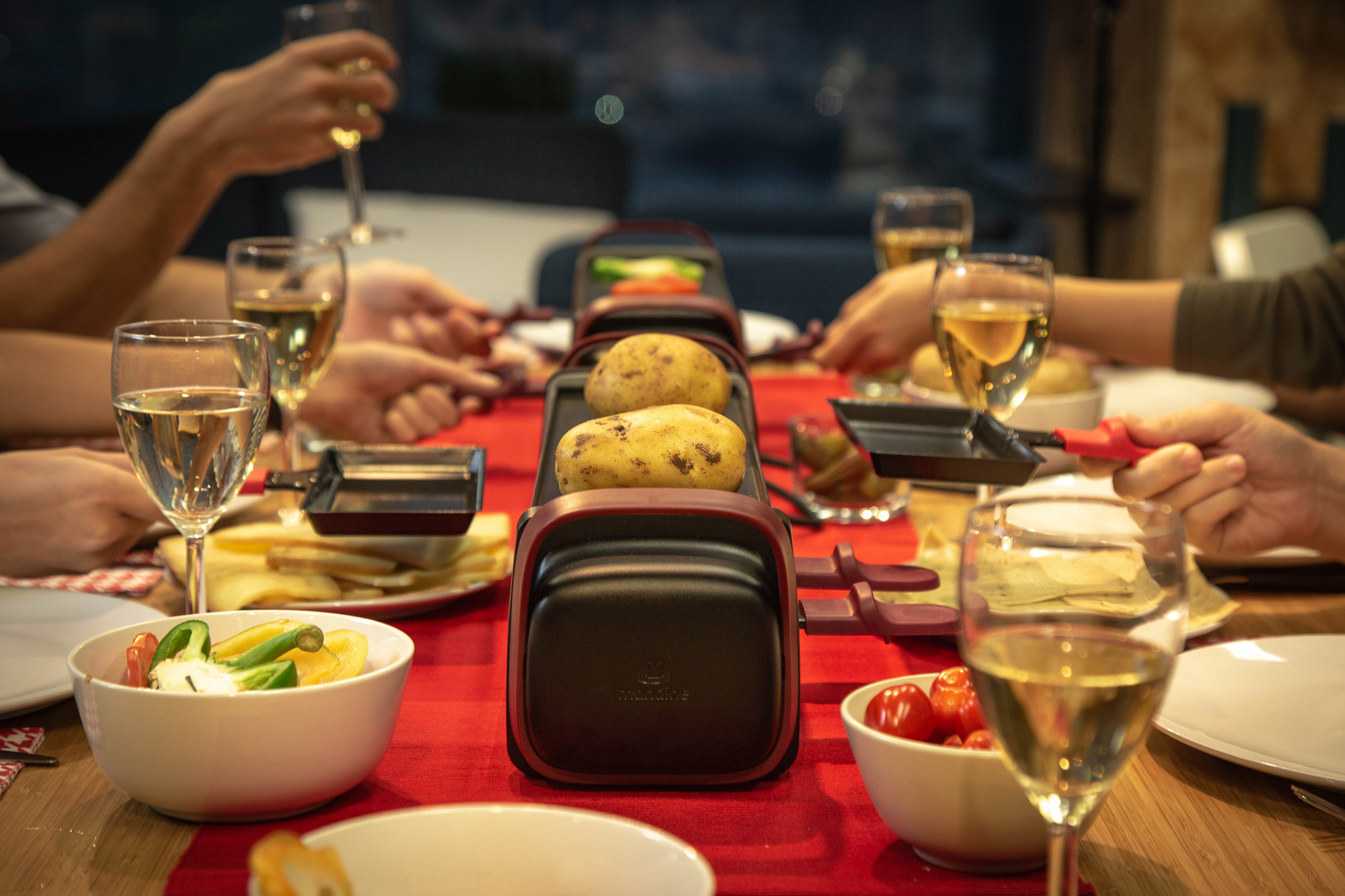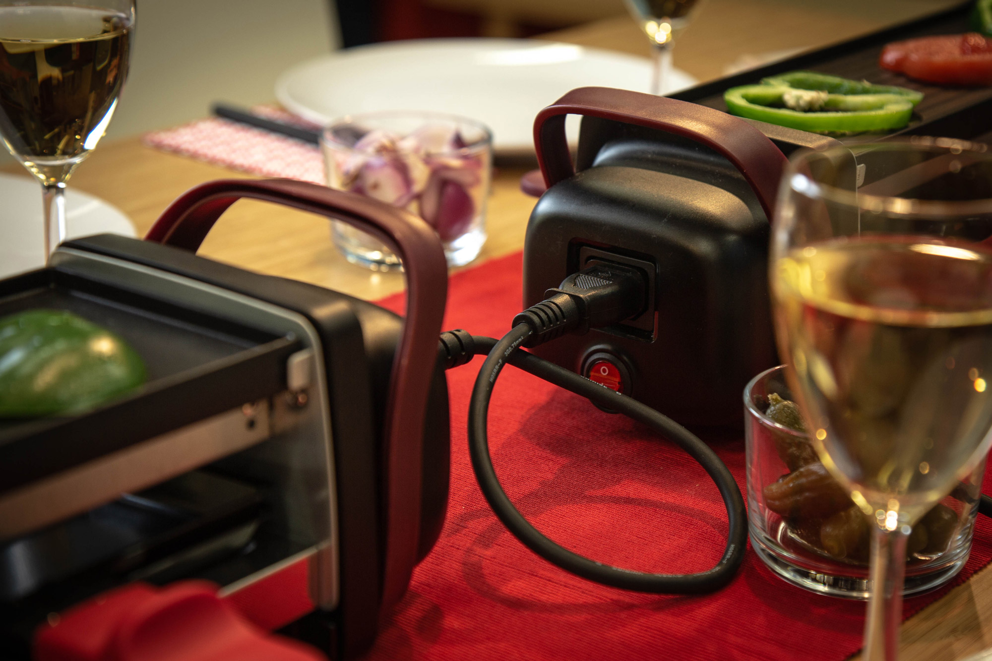 The Mandine DUO-LINK Raclette is a modular device designed to be placed at the center of the table. In contrast with the classic 8-persons raclette device, this product has the feature of being split into two 4-persons devices. This innovative feature is an answer to new behaviors in the kitchen: people are less attracted by bulky/all-in-1 products; they prefer compactness, modularity and flexibility. It is the perfect companion to your raclette party! You are a family of 4: use one device and save space on your table. Friends are coming over for dinner? Connect the second device directly onto the first one and you are all set! The second advantage is once the two devices are connected to one another, the set adapts to different table shapes so the raclette stays in a reachable distance to every single guest.